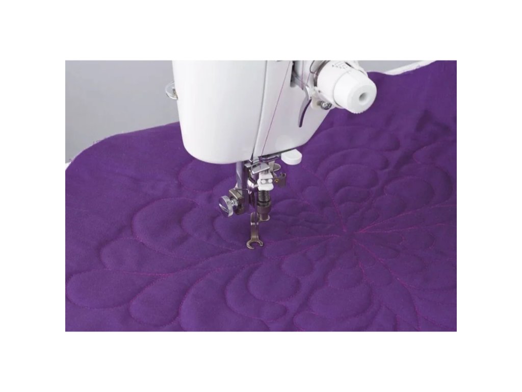 Zasúvanie podávača: Podávač sa dá jednoducho zasunúť alebo vysunúť pomocou prepínača. So zasunutým podávačom môžete precízne voľne quiltovať v ľubovoľnom smere.